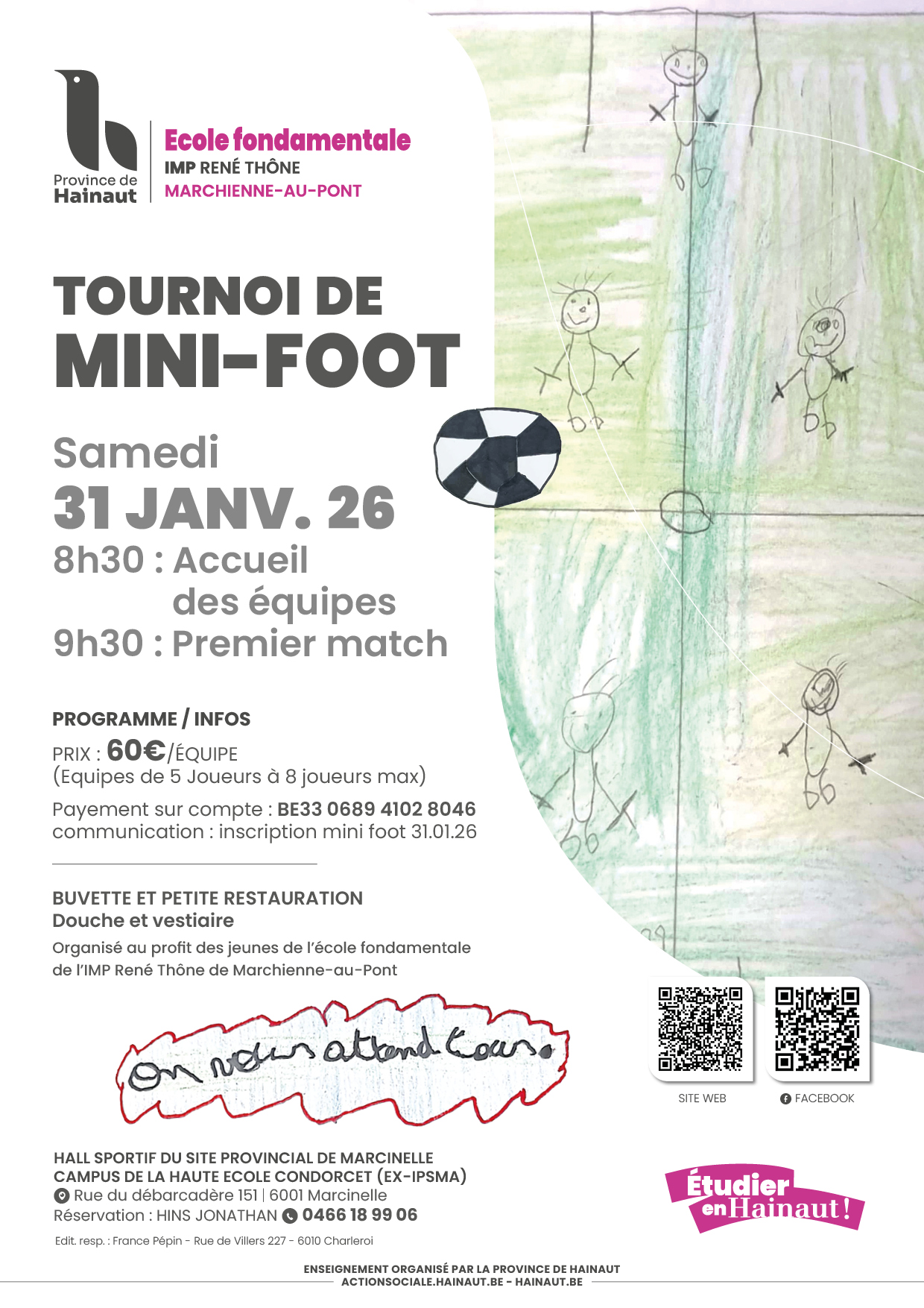 Que vous soyez sportif ou pas, n’hésitez pas à participer à l’annuel tournoi de mini-foot organisé par l’école fondamentale provinciale de l’IMP René Thône de Marchienne-au-Pont !