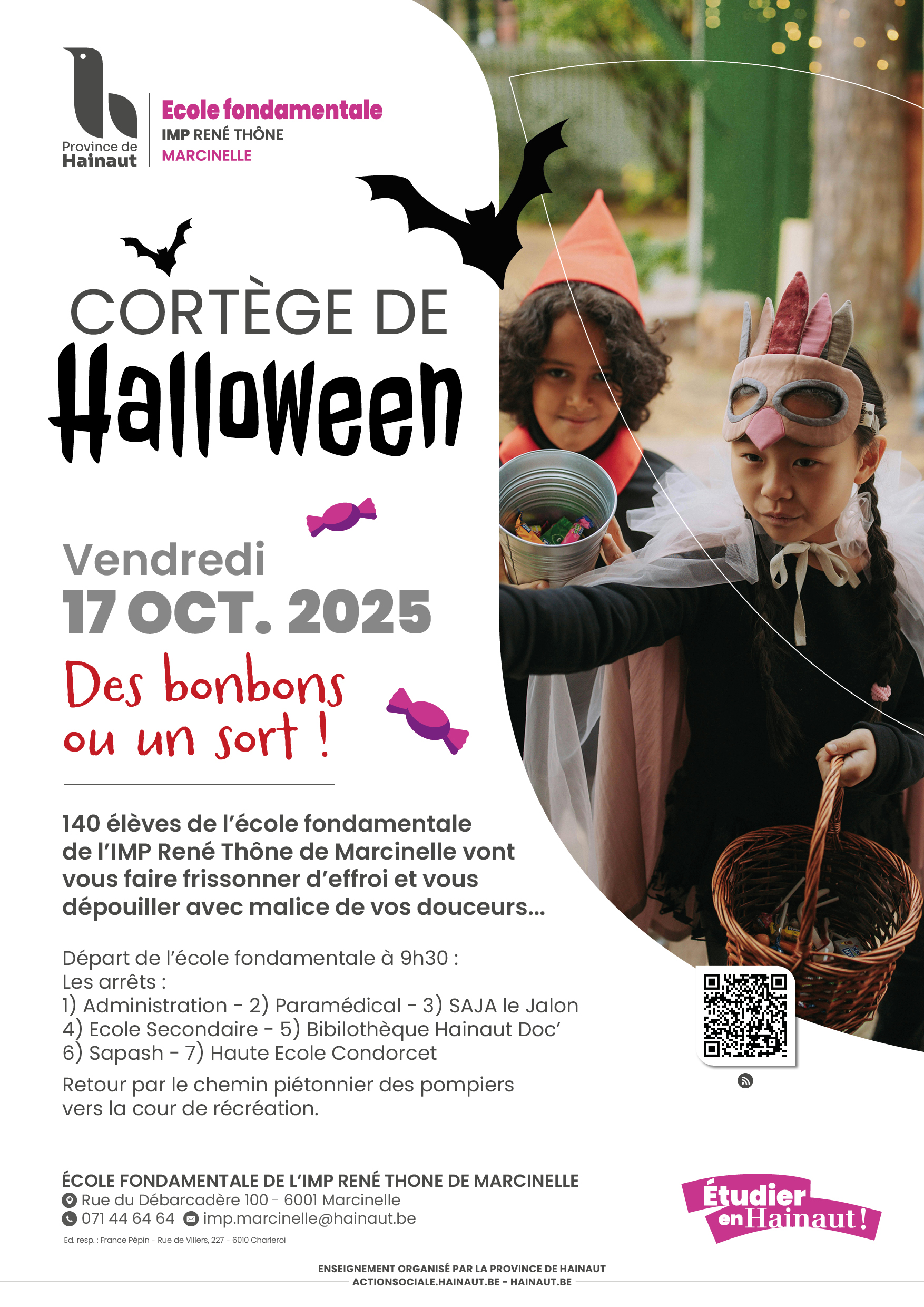 Des bonbons ou un sort ! Bientôt le cortège de Halloween pour les élèves de l’école fondamentale de l’IMP René Thône. Au programme de cet événement tant attendu, un défilé et plein de bonbons! À vos costumes le vendredi 17 OCTOBRE 2025