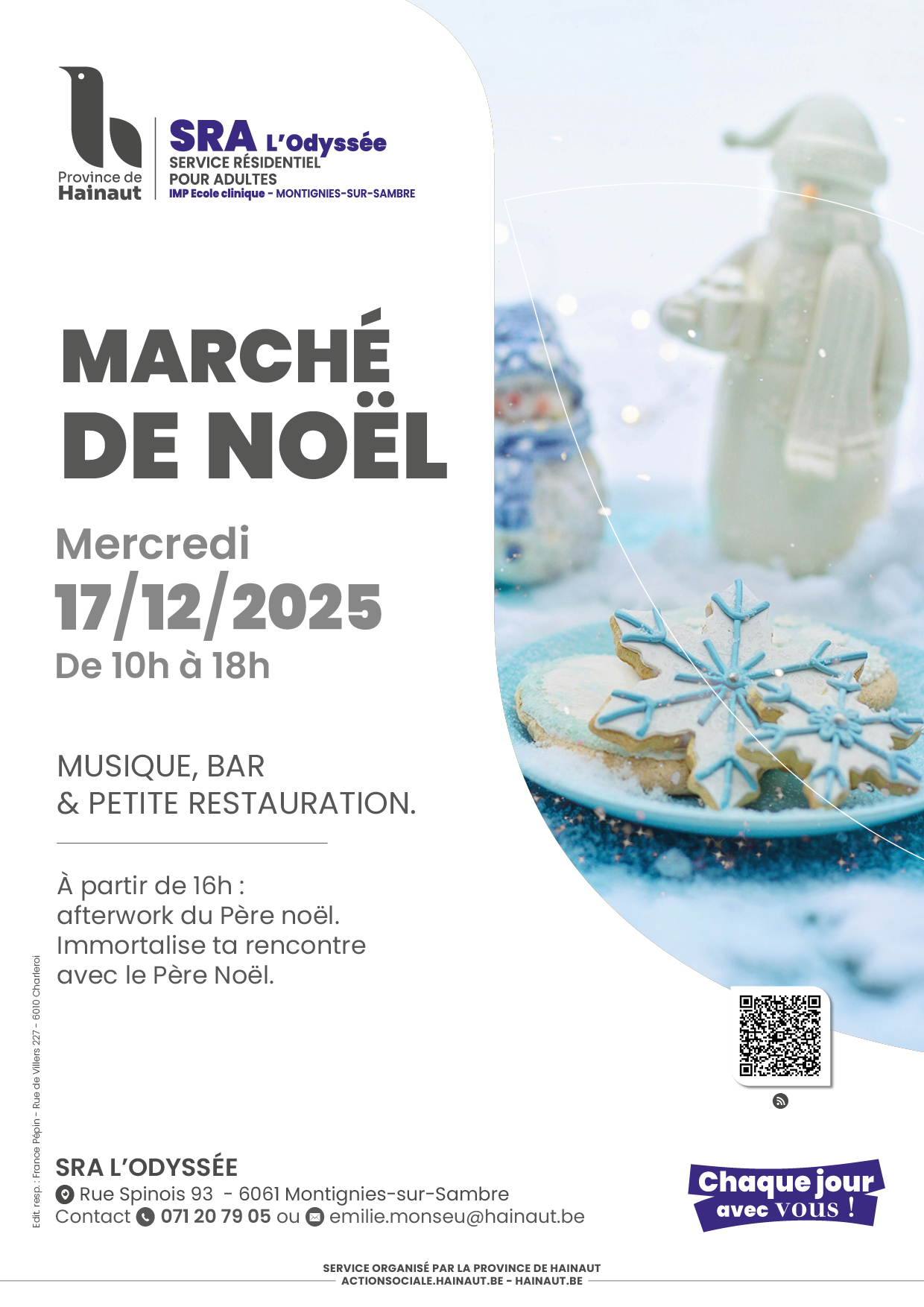 Le mercredi 17 décembre 2025, le SRA L’Odyssée – École Clinique vous invite à son Marché de Noël, de 10h à 18h00, pour une journée festive et conviviale. Profitez d’une ambiance musicale chaleureuse, d’un bar et d’une petite restauration, et laissez-vous porter par l’esprit des fêtes.
