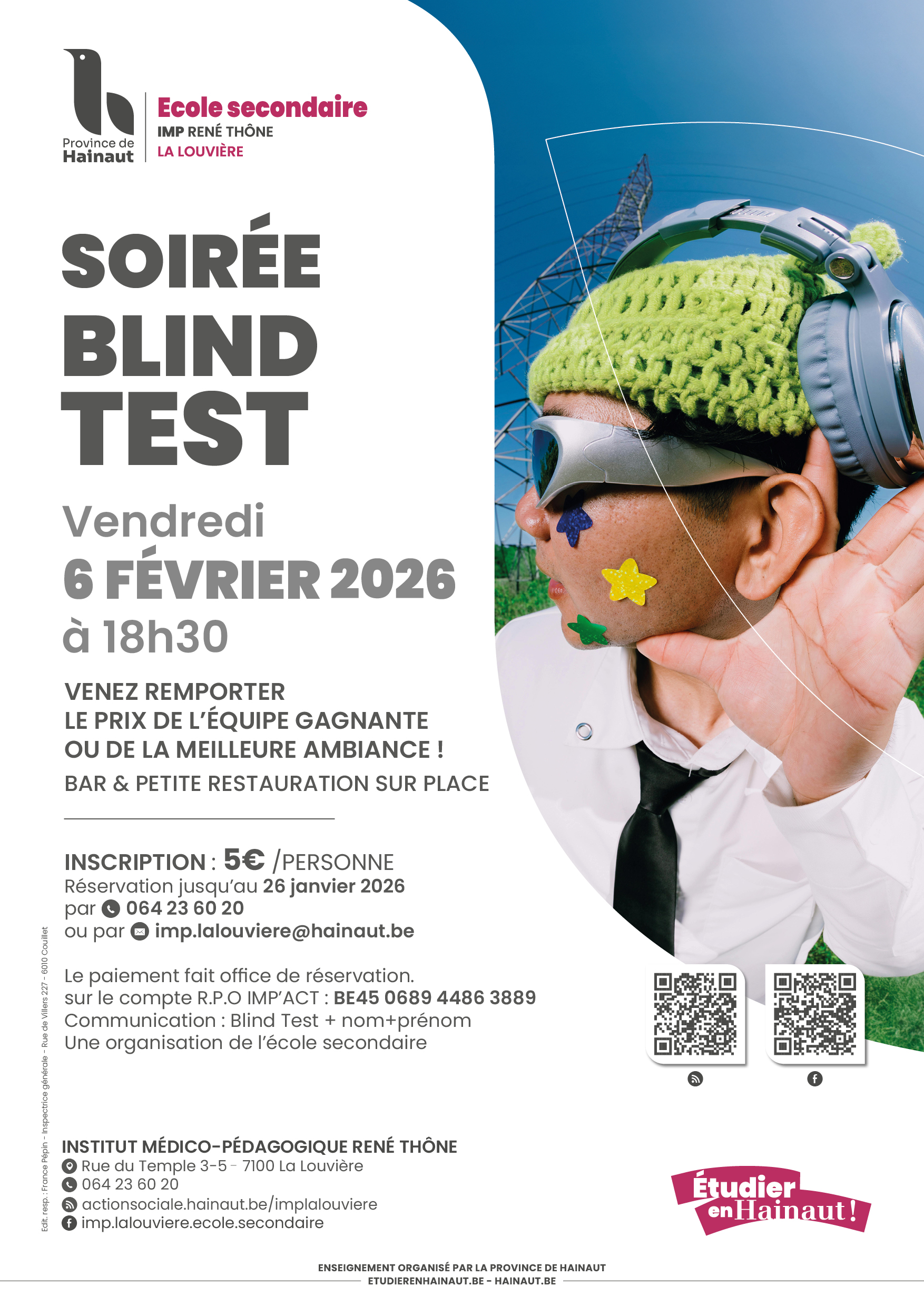 L’école secondaire de l’IMP René Thône de La Louvière organise une grande soirée Blind Test le vendredi 6 février 2026 à 18h30. L’événement est ouvert à toutes et tous, que vous soyez mélomanes aguerris ou simplement amateurs de bonne ambiance.