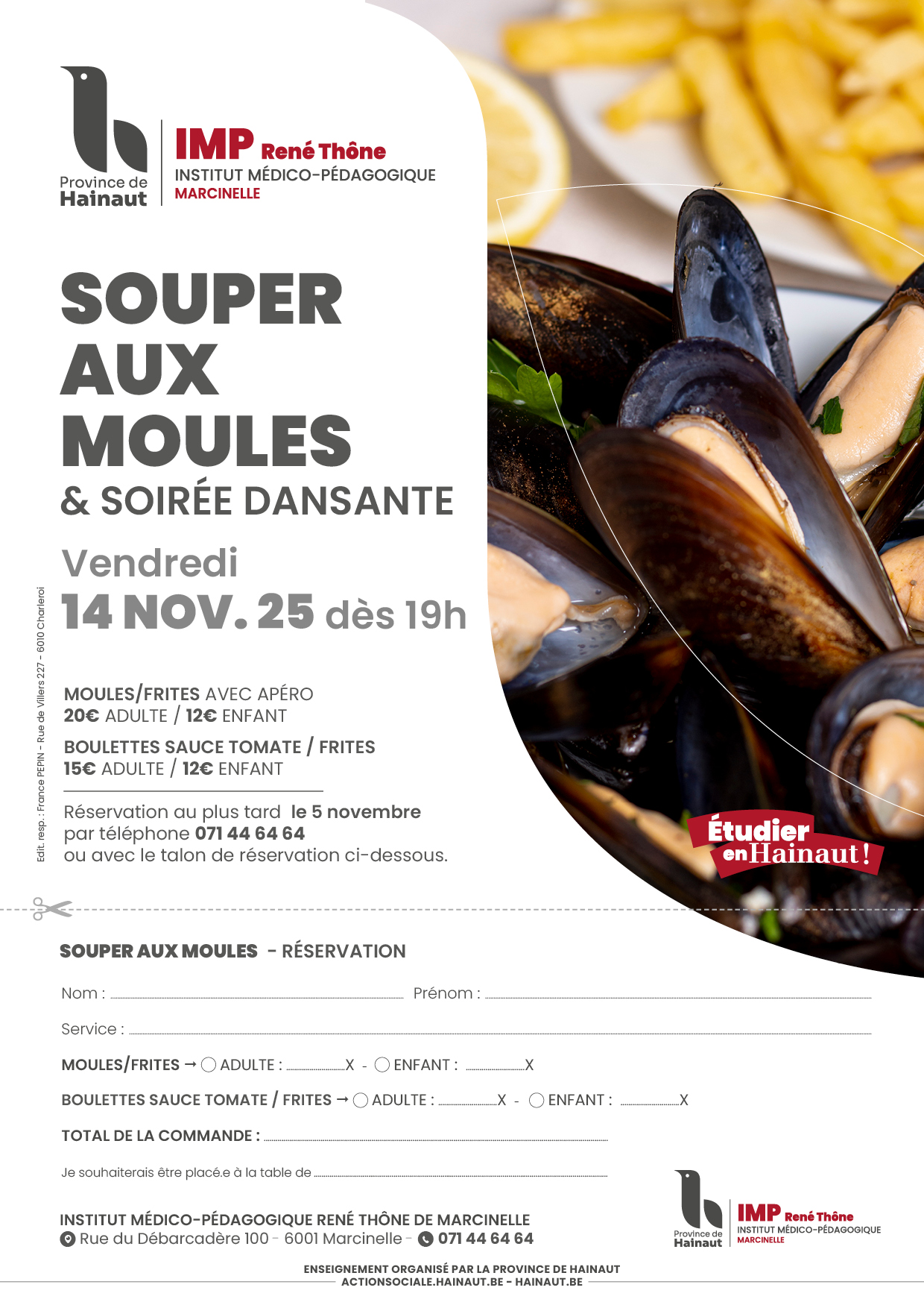 L’Institut Médico-Pédagogique René Thône de Marcinelle a le plaisir de vous inviter à son traditionnel souper aux moules, suivi d’une soirée dansante, le vendredi 14 novembre 2025 à partir de 19h.