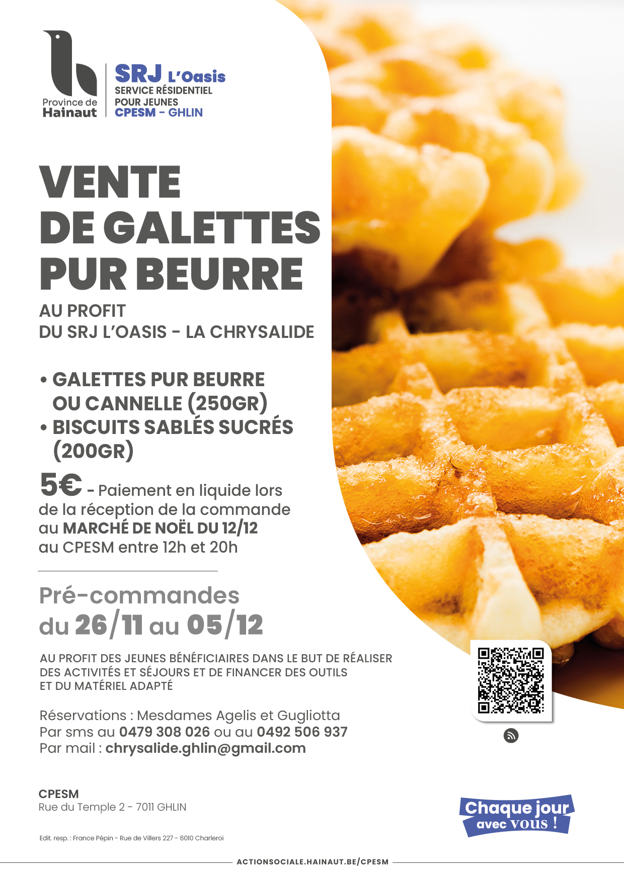 À l’approche des fêtes, soutenez les jeunes du SRJ l’Oasis – la Chrysalide en participant à notre vente de galettes pur beurre ou à la cannelle (250 g) et de biscuits sablés sucrés (200 g).